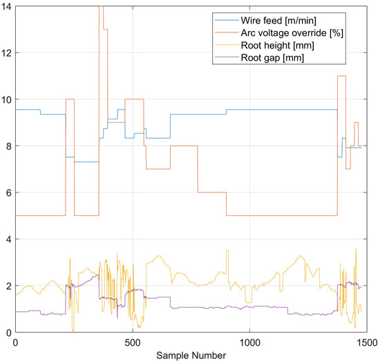 The data were further validated as follows: 25 mm from both ends of the experiments were excluded from the evaluation to prevent inconsistencies due to the welding start and end slopes. A similar procedure was carried out also in the positions of tack welds. As the knowledge bank only consisted of the welds where the quality is sufficient, the quality aspect of the data can be neglected. Hence, this results in a knowledge bank of welding preconditions (root gap and root face) and the welding parameters used (that enabled sufficient welding quality) which can be directly utilized for the NN training sequence. The validated data consisted of a total of 1477 pairs of input–output data. The validated data in Figure 6 show each parameter in the input–output pairs used for the NN training.