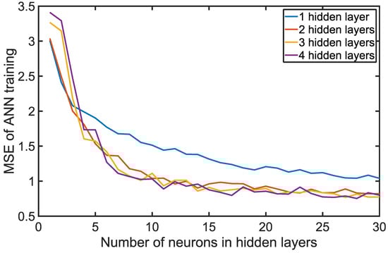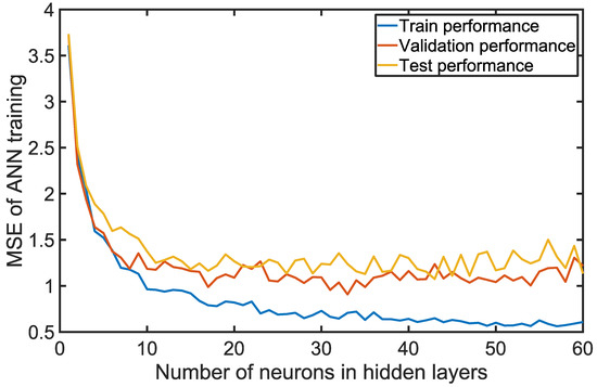 The NN was trained with 1–4 hidden layers with neurons ranging from 1 to 30 for each layer. The training set was divided into 70% for training, 15% for validation and 15% for testing. For statistical consistency, each optimization was run 30 times. Furthermore, the best-fitting hidden layer configuration was chosen, and the optimization of neurons was conducted by measuring the performance with 1–60 neurons. Finally, the performance was analyzed further by comparing training, validation and testing dataset performances (MSE) to find the optimal configuration.
