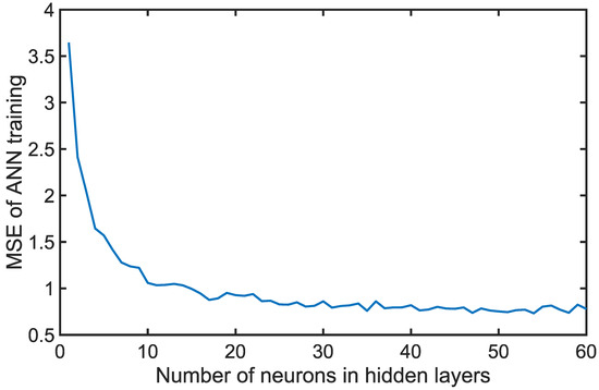 In this study, a Levenberg–Marquardt Algorithm (LMA) is used as an optimization algorithm in backpropagation, as LMA tends to perform well in optimization problems as proven in multiple studies [15,21,22,23,24,25,26,27]. The training process is similar regardless of what algorithm is used. The number of hidden layers and neurons is chosen by evaluating the effect of layer configurations (Hidden layers and neurons) on the Mean Squared Error (MSE) of the network, which is used for the performance evaluation of the network. The MSE was chosen because it has been widely used to evaluate the performance of the NNs and has been found to be an effective tool in previous studies [7,10,16,17,18,23,24].