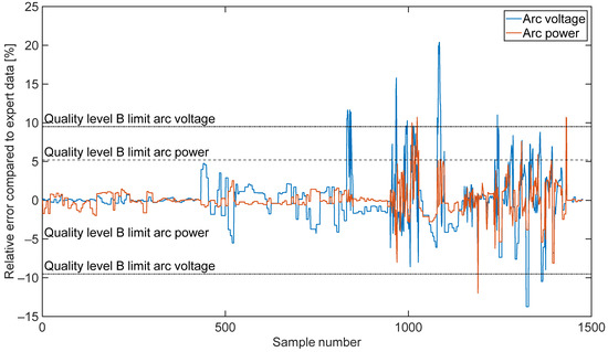 The performance and reliability of the IWS can be evaluated by comparing the standard deviation of the validated training dataset to the IWS decision-making compared to the training data. The percentual difference in the NN parameters (red is arc power and blue is arc voltage) compared to nominal parameter values from the training dataset are presented in Figure 12. Furthermore, the standard deviation limits of the validated training dataset, also defined to be the limits of quality level B, are presented as dashed and dotted lines in Figure 12.