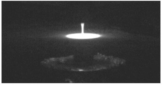 Prior to melting and atomization, the vacuum pump was run to ensure low oxygen content, being backfilled with up to 1 atm of He or Ar according to the atomization. The raw materials were induction melted to temperatures of 850 K and 1050 K, which corresponds to a superheating temperature of 250 K and 400 K, respectively. To ensure maximum homogenization of all elements, the molten metal atomization temperature was kept constant for 10 min. Molten metal was poured gravity onto the atomization disc rotating at 40,000 rpm. Figure 2 shows observations on the melt performance on the rotating disk during atomization made with a Vision Research Phantom v311 Monochrome high-speed camera.