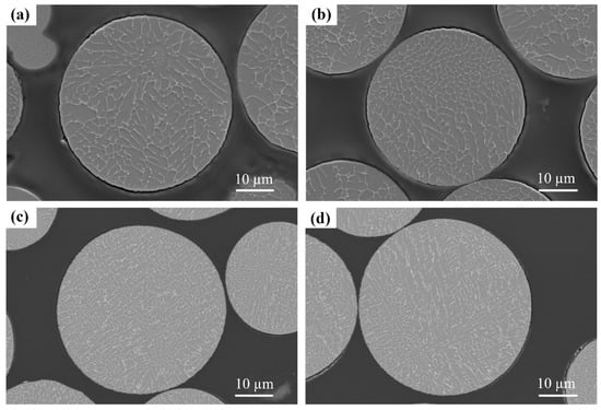 Following atomization, each of the as-produced powders was collected and sieved according to ASTM-B214-07 for 15 min with a Filtra FTL-0150 electromagnetic digital sieving machine into six fractions: 25–45 µm, 75–45 µm, 106–75 µm, 125–106 µm, 150–125 µm, and 180–150 µm. Samples of each size fraction from each experiment were subsequently metallographically prepared. A total of 25 samples were cold mounted using epoxy resin, mixing the metal powder with a small amount of epoxy resin and pouring it into the bottom of the specimen cup. Samples were ground using wet grit SiC paper of 600-800-1200-2400-4000, respectively, for one minute at a force of 20 N. The specimens were polished with diamond suspension solution of 6 μm, 3 μm, and 1 μm for 10 min in each step, applying a force of 20 N, and finally finishing with colloidal dispersions of silica (SiO2) for 10 min. The procedures were applied according to ASTM-B215, using standard metallographic methods for uncompacted metal powders []. The shape, microstructure and SDAS of the powders were investigated by using an Ultra Plus Field Emission Scanning Electron Microscope (SEM).