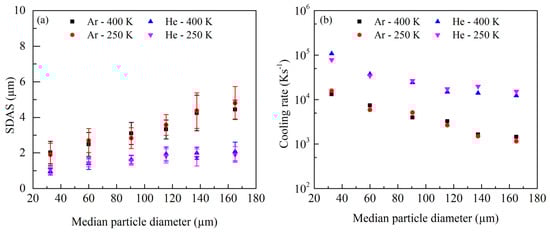 The relationship between SDAS with respect to the corresponding fraction size for each atomization run is plotted in Figure 5a, whilst a direct comparison of the SDAS to cooling rate as a function of the mean particle size is shown in Figure 5b [].