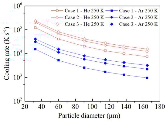The curves for Case 1 have the lowest values of cooling rate, between 2.7 × 103 Ks−1 and 3 × 104 Ks−1 for particles atomized in the Ar atmosphere and between 1.7 × 104 Ks−1 and 2 × 105 Ks−1 for particles atomized in the He atmosphere. The thermal conductivity kg evaluated at the ambient temperature TA corresponds to systems where the temperature differences between the particle and the fluid are small. Therefore, the thermophysical properties of the gas in the boundary layer do not vary significantly. Despite this and the great temperatures differences found in metallurgical processes such as centrifugal atomization, the evaluation of these properties continues to be evaluated at the ambient temperature for a large number of processes [,,], which may introduce errors in the final cooling rate results.
