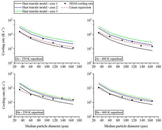 It becomes evident that in Case 3, where kg is evaluated at the surface temperature of the droplet Td, the model yields overestimated cooling rate values. It is worth mentioning that Wiskel reported that the gas properties evaluated at Td fit better for the impulse atomization process []. This may be due to the low particle velocity achieved during impulse atomization. When the relative velocity between the gas and the particle approaches zero, it seems of a good agreement to evaluate the gas properties at the droplet surface temperature Td. However, during the centrifugal atomization process, particles experience a high velocity provided by the disk speed. Thus, the surrounding gas renovation around the particle is faster than during impulse atomization; therefore, evaluating kg at the surface temperature of the droplet does not correlate with the experimental results.