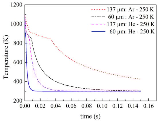 Moreover, Figure 8 shows that droplet temperature decreases faster with decreasing powder size from 137 to 60 µm within the same gas composition. For example, particles of 60 µm atomized in He atmosphere take 3.7 × 10−4 s, while particles of 137 µm atomized in the same atmosphere take 6.07 × 10−3 s to completely solidify, increasing one order of magnitude. These results confirm that while the gas composition is effective in influencing the cooling rate of the atomized particles, the cooling rate has a strong dependence on droplet size.