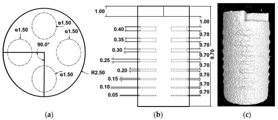 (a) Cross-section (top view) of the sample with four planned inner structures; (b) cross-section (side view) of the sample, showing the position of the inner structures and the variation of the volume. (c) CT images of the build PA12 sample.