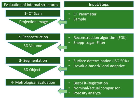 The investigation aimed to find a suitable workflow, as shown in Figure 2, to evaluate internal structures and features. Therefore, a surface determination was done on all samples using the isovalue-based method. An optional non-local means of volume filtering was applied to the data as needed. In the next step, a geometry fit was executed on the surface data, and the geometry was evaluated. In addition, the main focal points were the testing of the porosity algorithms and adaptations of the settings to detect internal structures. Although dimensional accuracy was certainly considered important, the analyses focused on improving the possibility of detection. An assessment was made comparing the results with micrographs and pycnometer measurements for PA12 and Ti64 (LBM, EBM) and ELO only for Ti64 (EBM).