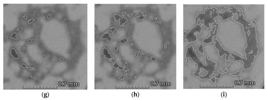 CT cross-section of internal structures in PA12 (a–c), Ti64 (LBM) (d–f) and Ti64 (EBM) (g–i). The white lines show the determined surface calculated: (a,d,g) with the Isovalue-based method (ISO 50%); (b,e,h) with the iterative advanced (classic) method (ISO 50%) and the use of ROIs of the background and material; and (c,f,i) with the advanced (classic) method (ISO 50%) and ROIs of the material and the gray value of an internal defect.