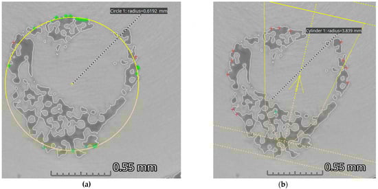 This measurement tool applied a fit of a geometry element to the determined surface mesh and allows a calculation of the deviation from the standard geometry. Concerning the planned internal structures, shown in Figure 1a, a cylinder fit or a freeform surface fit was suitable. The chosen fit for both, with the least squares method, with manually set initial fit points with auto-expand options, for a disk with a diameter of 0.06 mm and a step width of 0.015 mm for each point. The sampling method used a step width of 0.0075 mm and a maximum number of probing points of 10,000. The fit was performed with two iterations and the fit points were filtered with a search distance of 0.3 mm, a maximum gradient of 20° and a safety distance of 0.015 mm.