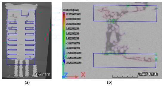 Using the best fit method facilitated an assessment of the deviation related to the CAD template. This method was sensitive to the deviation of the external shape, especially the reference structure on top of the sample. Figure 5a shows a mismatch in the CAD model caused by manufacturing deviations of the reference structures. Performing a nominal/actual comparison with an aligned template did not lead to beneficial results, since the manufacturing process initiated channel opening and caused deviations in the position of the internal structures, as shown in Figure 5b.