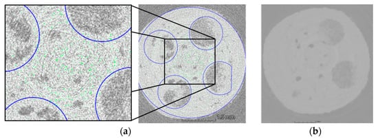 Cross-section of PA12 sample at a height of 7.5 mm. (a) Performing VGEasyPore algorithm on the noisy surface data set (green) with the aligned CAD model (blue) to locate the internal structures. (b) Cross-section of the voxel data of PA12 after non-local-means filtering.