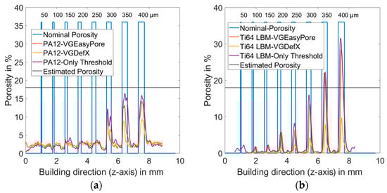 Direction variability of the porosity along the building direction for (a) PA12-sample and (b) Ti64-sample (LBM), calculated using VGEasyPore (orange), VGDefX (yellow), and the Only Threshold Method (purple). The nominal porosity (blue) of the CAD is aligned to the data and an estimated porosity value is drawn in black.
