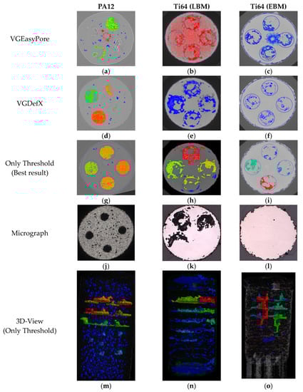 The main focus of this examination was to adapt the parameters of the porosity algorithms as best as possible in order to evaluate internal structures. Using the default settings, as described in Section 2.5, the best possible results, in terms of maximum detection of internal structures, minimum noise and fewer process-related pores were considered. The changes to the default settings for each algorithm are displayed in Table 2. The outcome was colored with respect to the volume, ascending from small volume in blue (min. 8 vx) to red (max. 11,220 vx). Using the direction variability with a normal vector aligned to the building direction (z-axis) and a resolution of 1 vx/slice, the porosity within the cross-section in the perpendicular xy plane was summed up and plotted as a function of the z-axis, as seen in Figure 7a for PA12 and Figure 7b for Ti64 (LBM). The direction depending porosity was measured and plotted for VGEasypore (orange), VGDefX (yellow) and Only Threshold (purple).