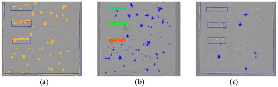 CT cross-section of PA12. (a) Analyzing area (yellow) of the considered defects with the VGDefX algorithm. (b) Results of the VGDefX analysis, obtained using the settings mentioned in Table 2 for PA12, and (c) results of the VGDefX analysis obtained by switching the material definition to manual.