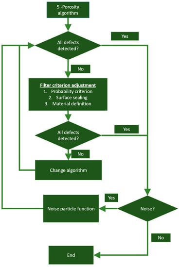 In summary, a recommendation for a procedure for analyzing internal defects was derived from the results of different materials, processes and analyses. The workflow illustrated in Figure 2 should be added to the workflow shown in Figure 11 for the analysis of CT porosity. For the adaption of the algorithm there were three main steps: