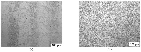 As can be presumed from Figure 5, the microstructure of Ti6Al4V can be considerably influenced when applying the HIP treatment. As a result of the L-PBF process, a fine microstructure developed in a martensitic (α’) needle shape due to the rapid fusion and posterior solidification (Figure 5a,c). However, after the HIP thermal treatment at 920 °C, below the β transus (955 °C) temperature, the fine martensitic microstructure transformed into a mixture of α and β phases, where the α phase presents as fine plates (Figure 5b,d). HIP treatment also induced a coarsening of the microstructure compared to the original α’.