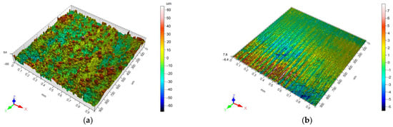 In Figure 8 and Figure 9, the topography of the surfaces in each condition is detailed. As-fabricated parts exhibited partially melted particles on the surface (a), being responsible for the resultant rough surface. The surface topography of the samples treated with the applied methods was transformed significantly. Machined surfaces (b) look smooth, although some machining parallel marks can be seen by confocal microscopy. With blasting (c) and E-Blasting (d), the partially melted powder particles were removed completely. However, the surface treatment with the blasting method displayed peaks and valleys, whereas the E-Blasted samples showed a smoother and brighter appearance. As is evident in (e), the conditions first tried in the tribofinishing technique were not able to totally eliminate the partially melted particles, and important cavities were left on the surface. Increasing the time of the process, no partially melted particles were observed, but still, some residual cavities were detected (f).