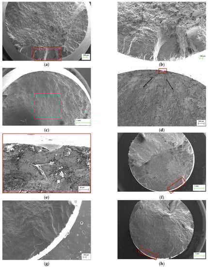 As explained previously, the fatigue crack was initiated from defects found on the samples’ surfaces regardless of the type of surface treatment applied. For instance, the cavities that originated in E-Blasted samples are stress concentrators that initiate cracks (Figure 13e). Figure 13d shows the crack initiation site (red rectangle) in addition to the fatigue crack growth direction (black arrows). Further magnification of the area around the crack initiation site (Figure 14a) reveals that the fracture is generally dominated by transgranular fracture mechanisms, where the fracture takes place through the grains. Instead, the micrograph corresponding to the area far from the crack initiation site (Figure 14b) indicates that in the last stages, the fracture occurs by intergranular mechanisms, in which the crack propagates along grain boundaries. Similar behavior was observed for the rest of the surface treatments.