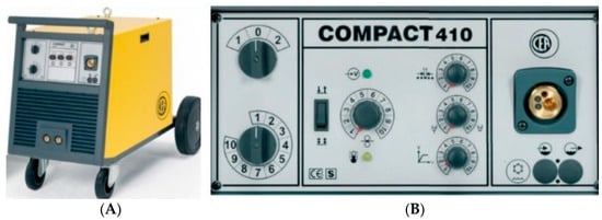 The CEA COMPACT 410 welding machine, which was utilized in this study, has the capacity to be adjusted to varying levels of current and filler feed rate. This feature enables the machine to be utilized for a wide range of welding tasks, with precision and high-quality results, including those on different types of materials, such as steel, stainless steel, and cast iron. For this, the first switch should be set to number one, indicating that each number on the second switch represents a value of 20 A. For instance, when using the second switch, number one corresponds to 20 A, number two corresponds to 40 A, and so on, until you reach number ten, which represents 200 A. As shown in Figure 3A,B.