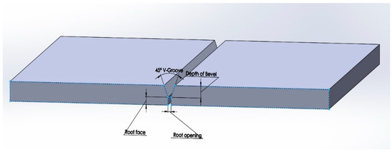 In this context, the workpiece utilized is composed of AISI 316L material and has a size of mm. It also possesses a bevel angle, root face, and root opening of 45° V groove, 2 mm, 1 mm, respectively, as illustrated in Figure 4. Additionally, Table 1 outlines the chemical composition of the AISI 316L material. AISI 316L is a versatile stainless-steel alloy with excellent corrosion resistance. Its mechanical properties include a typical tensile strength of 560 MPa, yield strength of 290 MPa, elongation of 50%, hardness ranging from 79 HB onwards, and impact toughness of 103 J/cm2. The information on AISI 316L regarding its material properties was obtained from Mat Web [48].