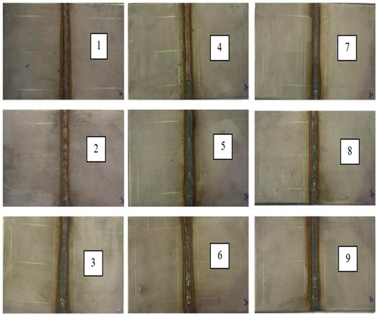 The Taguchi method was utilized to optimize the MAG welding parameters, and the experimental sample size required for this study was nine samples, as displayed in Table 4. This corresponds to the L9 orthogonal array design, which involved three parameters and three levels.
