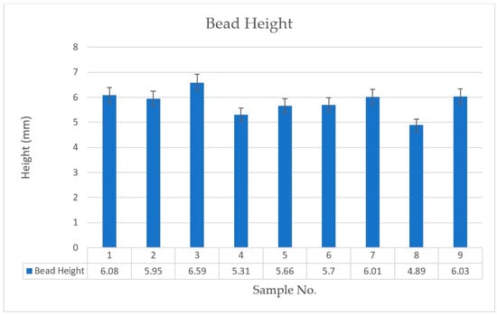 The height of the beads in the sample batch is uniform and closely matched. Sample No. 3 had the highest bead height of 6.59 mm, due to the welding parameters of the arc current, filler feed rate, and gas composition (120 A, 4 m/min, and G3, respectively). In contrast, Sample No. 8 had the lowest bead height of 4.89 mm, due to the welding parameters of the arc current, filler feed rate, and gas composition (200 A, 3.5 m/min, and G1, respectively). Changes in the wire filler feed (3 to 4 m/min) and the gas composition (G1, G2, and G3) affected Samples 1, 2, 3, 4, 5, and 6, as shown in Figure 6. Moreover, increasing the arc current from 120 to 180 A (heat input) led to a decrease in the bead height, as observed in both sets of samples, namely Samples No. 1–3 and 4–6.