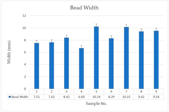 The GMAW parameters of the arc current, filler feed rate, and gas composition for Sample No. 5 and Sample No. 7 are 160 A, 3.5 m/min, and G3; and 200 A, 3 m/min, and G3, respectively, and they have the highest bead width values of 10.24 mm and 10.15 mm, respectively. Sample No. 4 and Sample No. 1 (160 A, 3 m/min, G2; and 120 A, 3 m/min, G1) have the lowest bead width values of 6.69 mm and 7.52, respectively. Samples 1, 2, and 3 were modified by varying the filler feed rate (3, 3.5, and 4 m/min) and the gas composition (G1, G2, and G3), while maintaining the same current of 120 A. While increasing the filler feed rate can result in an increase in the amount of metal deposited and a wider bead, the effect may be relatively small. Furthermore, for Samples 5, 6, 7, 8, and 9, the results indicate that the bead width increased as the current parameter was increased to both 160 and 200 A. This finding is consistent with the previous research conducted by Saha et al. [24], which showed that the bead geometry becomes wider with an increase in heat input (current). Moreover, the shielding gas composition significantly affects the change in the bead width values, regardless of the other welding parameters [52].