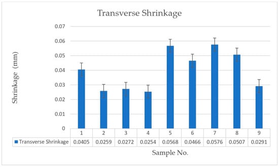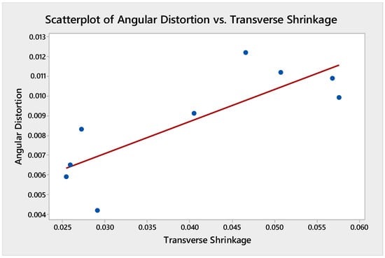 Figure 9 shows that the transverse shrinkage increased from Sample 1 to 2 due to changes in the filler feed rate (3 and 3.5 m/min) and gas composition (G1 and G2). However, for Samples No. 2, 3, and 4, the values indicate that the filler feed rate did not have a strong effect on transverse shrinkage. Additionally, the change in the arc current (from 160 A to 200 A) from Sample No. 5 to Sample No. 9 interacted strongly with the gas mixture, generating greater heat input, and resulting in an increase in transverse shrinkage. This finding is consistent with a study that was conducted by Tian et al. [55]. Increasing the heat input over a larger area of the sheet may lead to an increase in the shrinkage area on the workpiece, resulting in transverse shrinkage. To mitigate this effect, pre-heating can be used to ensure a uniform distribution of heating and cooling inputs [59]. Samples No. 2, 4, and 9 (G2) had the same gas composition. Irrespective of the other welding parameters, the shielding gas mixture had a significant impact on decreasing the transverse shrinkage values. The relationship between angular distortion and transverse shrinkage was direct, with increasing angular distortion leading to an increase in transverse shrinkage, as shown in Figure 10. Moreover, the same results were observed in a study by Fernandes et al. [57].