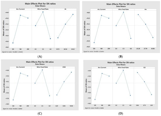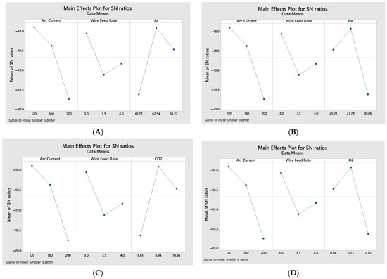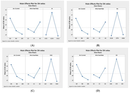 The effect of welding parameter plots on bead width. (A) the effect of Ar (B) the effect of He (C) the effect of CO2 (D) The effect of O2.