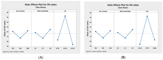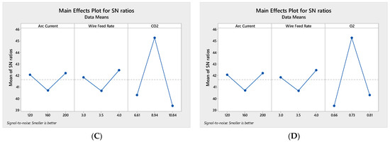 The arc current is the most effective MAG parameter for controlling the bead width, gas composition, and filler feed rate. After conducting an ANOVA analysis, the optimal welding parameters were found to be an arc current of 120 A, a filler feed rate of 3 m/min, and a gas composition of G2. The ANOVA results also revealed the following percentage of effects of each welding parameter: an arc current of 43.19%, a filler feed rate of 11.67%, and a gas composition of 34.88%, as shown in Table 8. Furthermore, it was determined that the most influential MAG parameters, based on the contribution percentage (ANOVA), should be consistent with the S/N ratio (rank), as shown in Table 9. The corresponding figures for each gas component are shown in Figure 12A, Figure 12B, Figure 12C, and Figure 12D, respectively.