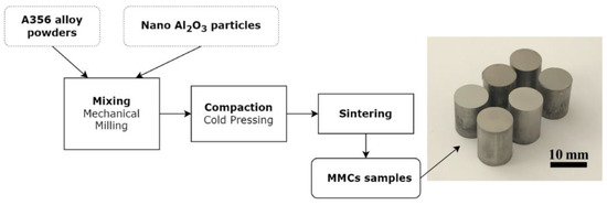 A356/Al2O3 nanocomposite samples with six reinforcement ratios (0–12.5 vol.%) produced via PM were used as workpiece materials for micromilling tests. A356 (LPW Technology Ltd., Runcorn, UK, APS: 46 µm, chemical composition: 7.5 Si (%wt.); 0.7 Mn; 0.4 Mg, 0.2 Fe; 0.2 N; 0.2 O; 0.15 Ti; 0.05 Cu; 0.1 Zn) and Al2O3 powders (Nanografi Inc., Jena, Germany, APS: 20 nm) were mechanically milled for 4 h in Fritsch planetary ball milling device with a single chamber (capacity: 225 mL). After mechanical milling, the powders were cold pressed (600 MPa) to produce green samples. The green samples were sintered at 565 °C for 1 h in a vacuum furnace. A total of six workpieces with different reinforcement ratios were manufactured. The microstructures of MMCs produced via powder metallurgy consist of primary alpha aluminum containing small silicon phases shaped like particles called eutectic structures (Figure 5). The dimensions of each cylindrical sample are 10 mm in diameter and 15 mm in length. Figure 1 represents the manufacturing route of the nanocomposite workpiece samples.