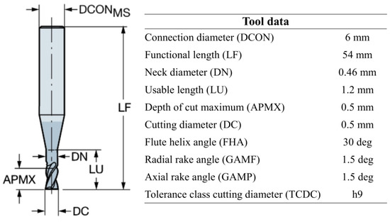 Precisa XB200h density measurement kit was used for the density measurement of the A356 alloy and the nanocomposite samples. Hardness tests were carried out on AFFRI VRSD 251 hardness tester. Brinell hardness method was applied to the samples with 31.5 kgf load for 5 s. The average value was calculated from five different measurements on each sample. Kern EVO 5-axis CNC micromachining center was used for the cutting experiments. Sandvik CoroMill Plura solid carbide end milling (R216.32-00530-AE05G 1620) tools with an edge radius of around 10 µm, a diameter of 0.5 mm, and a flute helix angle of 30 deg. were used for micromilling tests. Figure 2 shows the geometric properties of the micromilling tool. Schunk-Tribos clamping device was used as a tool holder.