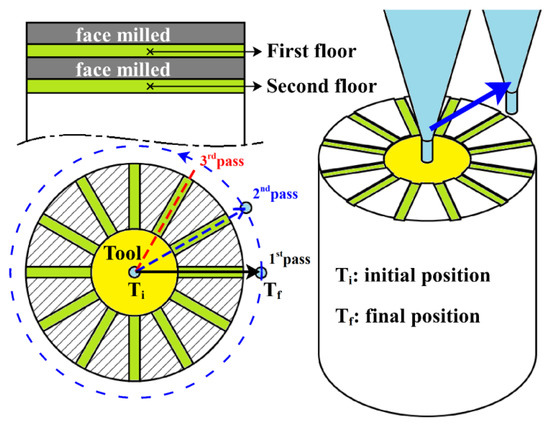 Due to the cylindrical shape of the MMC parts, a milling strategy in which the tool moves from the center to the outer surface was adopted. Face milling was applied to clean the top part surfaces, followed by the cutting tests with the variable conditions listed in Table 1. To generate better control of the cutting, a cylindrical pocket was applied at the center of the workpiece prior to the execution of the main cutting tests. Because of the limited surface area of the workpiece, this experimental study was divided into two sections, including 72 tests (12 for each material) conducted on the first floor using the first tool and 72 tests performed on the second floor using the second tool. After collecting experimental investigations on the first floor, face milling was applied to remove residuals, and the second floor was obtained. Further experiments were carried out on this second floor. Figure 4 shows a representation of the micromilling strategy. The experiments were conducted in random order, trying to prevent the possible effects of all the unmeasured external factors.