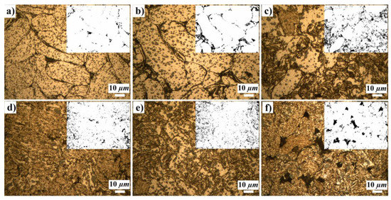 The composite powders can be considered ductile–brittle (A356-Al2O3) components. During mechanical milling of ductile–brittle components, the ductile metal powder particles are flattened via deformation (ball–powder–ball or ball–powder–wall), while brittle particles are fragmented. These brittle particles tend to be trapped within ductile particles. With further milling, the ductile powder particles are work hardened and refined via crimping/folding [34]. Such microstructural effects were also observed in the microstructures of the samples obtained in this study. Figure 5 shows the microstructures of workpiece materials (after sintering) with different reinforcement ratios subjected to the same mechanical milling route. With higher reinforcement ratios, ductile particles are deformed and refined with smaller and more complex forms. The analysis of the sintered parts conducted prior to cutting them allows us to confirm that the sintered part density decreases along with the nanoparticle reinforcement. In particular, the values of the A356 alloy and nanocomposite reinforced materials resulted as 96.13 ± 0.26 (A356), 96.30 ± 0.36 (2.5% reinforced), 93.93 ± 0.38 (5% reinforced), 90.40 ± 0.49 (7.5% reinforced), 88.74 ± 0.27 (10% reinforced) and 85.78 ± 1.47 (12.5% reinforced). A noticeable drop in density is found for reinforcements higher than 2.5%, and a total reduction of 10.77% is generated by adding 12.5 vol.% nano-Al2O3 reinforcement in the A356 matrix (Figure 5). The minor images in Figure 5, created by filtering the microstructure images by similar thresholds, highlight the pores (black) and their distribution.