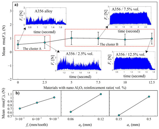 There is an apparent increasing effect of the nano loading on the cutting force generation; see Figure 6a. When machining the A356 alloy reinforced with nano-Al2O3 particles, the average resultant forces are clearly increased. This can be likely due to the strengthening mechanism of A356 matrix alloy via nanoparticle reinforcement. As nanoparticles improve the strength of the material, this will cause more resistance to shear deformation imposed by the machining process. Based on the average force values together with the regularity of the force generation, as depicted in Figure 6a, it is possible to split the materials into two clusters. Cluster A, composed of A356 alloy and A356/2.5 vol.% Al2O3 nanocomposite, and cluster B for the A356/5–12.5 vol.% Al2O3. The former group shows very irregular force profiles, while the latter present generally higher forces with a very regular and stable force generation. Although the hardness increases with the nanoparticle reinforcement in cluster B, the cutting force does not show a similar trend. After 5 vol.%, average cutting forces fluctuate with increasing reinforcement ratios. As for the effect of process parameters, the feed per tooth value affects the cutting forces in an almost linear way by increasing them consequently. This somehow highlights the special cutting behavior of this material, which does not show the typical strong nonlinear behavior of the average cutting power with the feed per tooth values. At the same time, there is an expected positive effect on the cutting forces of the axial and radial depth of the cut (Figure 6b). The former presents a proportional effect that agrees with the typical microcutting behaviors, whereas the latter presents a less impacting outcome. The ANOVA analysis in Table 2 indicates that all factors are statistically meaningful for average cutting forces.