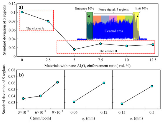 In order to provide deeper insight into the above-mentioned regularity of the cutting forces, a synthetic indicator is analyzed, consisting of the standard deviation of the average rms force values along the slot. If the rms keeps constant, the standard deviation is zero; otherwise, it increases. The signal in the central slot region is divided into five portions, and the standard deviation of the rms force value is extracted for each portion (Figure 7a). Entrance and exit regions were excluded since they involve the tool engagement and disengagement transients that kinematically affect force generation. According to the claims provided in the previous section, the quantitative analysis of the cutting forces’ regularity, shown in Figure 7a, reveals that the two clusters exist. Cluster A showed much more irregular micromilling forces compared to cluster B. These values represent the regularity or stability of cutting forces acquired during micromilling. The higher values mean the cutting forces are irregular for this test. The higher irregularity shown via cluster A is much higher, considering that lower magnitude average cutting forces occur in this cluster than in cluster B. The regularity of cutting forces is also affected by the process parameters. Each process parameter, feed/tooth, axial depth of cut, and radial depth of cut, affects the force regularity negatively. Lower parameter values result in more regular cutting forces (Figure 7b). ANOVA analysis indicates that factors, except for feed per tooth, are statistically meaningful for the regularity of cutting forces. When all factors are evaluated separately for each cluster, besides the great force regularity difference between the two clusters, the force regularity of cluster B was seen to be less affected by the reinforcement ratio and the process parameters with respect to cluster A (Figure 8a,b). On the other hand, the axial and radial depth of cut were statistically significant for cluster A and cluster B (Table 3).