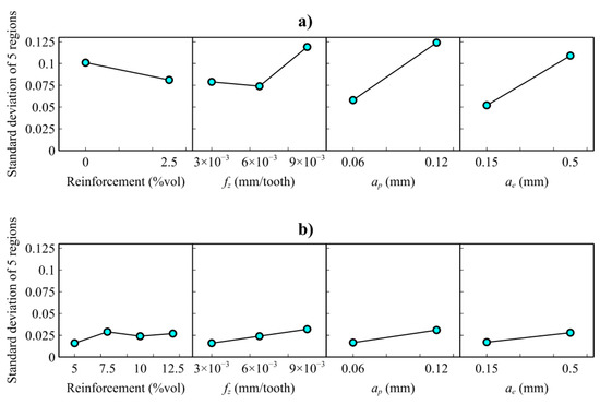 Main effect plots of the regularity (standard deviation) of the resultant cutting force values. The analysis is split into (a) cluster A (A356 alloy and A356/2.5 vol.% Al2O3, (b) cluster B (A356/5–12.5 vol.% Al2O3).