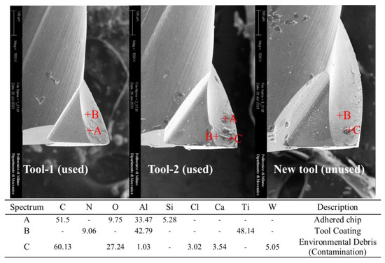 On one side, there are no doubts that the tools’ performance is directly influenced by the mechanical properties of the material and the volume fraction of nanoparticles, but on the other, the conducted micromachining tests revealed only a negligible impact on the tool wear. Given the limited cutting length carried out in the tests, a clear identification of the effect of the loading ratio on the tool wear was not possible. Figure 9 shows the SEM analysis of the tool wear after micromilling of the first (by tool-1) and second floors (by tool-2) of the workpieces. Although this kind of wear assessment could not quantify the rounding on the cutting-edge radius, the resulting images indicate that beyond the residual material sticking to the tool edge (see point A, Figure 9) and environmental debris (contamination, point C, Figure 9), negligible tool wear occurred during the conducted micromilling tests of MMCs.