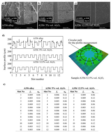 Burr formation on the top surfaces of the workpieces, (a) SEM images of slot 9 on A356 alloy, (b) slot 10 on A356/5% vol. Al2O3, (c) slot 8 on A356/12.5% vol. Al2O3, (d) surface profiles of selected workpieces, (e) the cutting conditions of selected workpieces.