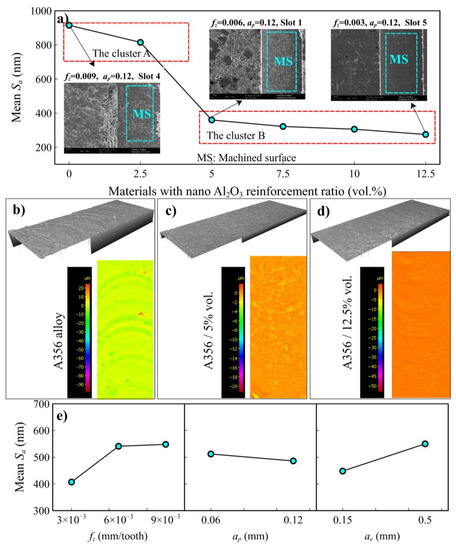 Figure 11 shows the mean effect plots of the Sa values concerning the reinforcement ratio and process parameters. Similar to the burr results, cluster A showed higher surface roughness than cluster B (Figure 11a). This quantitative evidence supports that nanoparticle reinforcement can alter the chip generation mechanisms, limiting the plowing/rubbing contributions and providing better surface qualities. While the surface roughness values were comparably high in A356 alloy, it was observed that the values decreased approximately three times with 5% vol. Al2O3 nano reinforcement. Figure 11b–d also supports the improvement of surface quality by indicating and comparing the 3D surface topographies of slot surfaces (A356 alloy, A356/5% vol., and A356/12.5% vol. Al2O3).