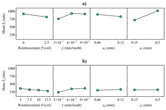 Mean effect plots of Sa, (a) cluster A (A356 alloy and A356/2.5 vol.% Al2O3) and (b) cluster B (A356/5–12.5 vol.% Al2O3).