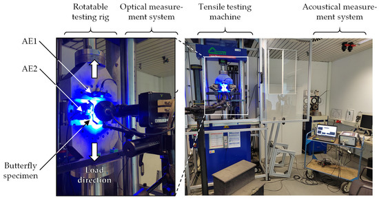 Experimental setup for butterfly tests in a tensile testing machine with optical and acoustical measurement systems.