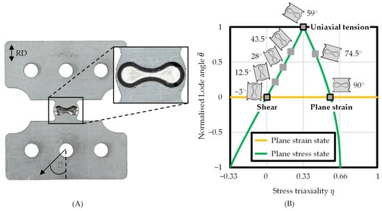 The applied butterfly specimen is shown in Figure 3A. The contour was cut with water jet, and the inner part of the specimen—which has the shape of a unity mark—was micro-milled on both sides. The rolling direction was perpendicular to the inner part. Because of the unity-mark-shaped inner part, fracturing occurred inside the specimen and no edge cracks appeared. With the rotatable testing rig, the butterfly specimen can be tested at different angles α of −3°, 12.5°, 28°, 43.5°, 59°, 74.5°, and 90° to the loading direction, which results in different stress states. Therefore, in the centre of the specimen shear loading, uniaxial tension, plane strain tension and combined stress states are created, which are shown in Figure 3B. One benefit is that one specimen can be used for testing different stress states. Furthermore, the stress states between shear and uniaxial tension can be characterised in a high resolution, as also shown in Figure 3B, which is another advantage of the specimen.