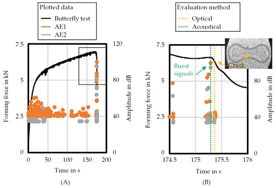 Overview of forming force–amplitude over time measurement from a butterfly specimen (A) and optical as well as acoustic evaluation methods for material fracture (B).