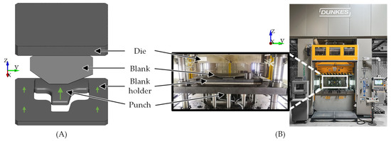 Numerical model (A) and experimental setup (B) of the deep drawing tests.