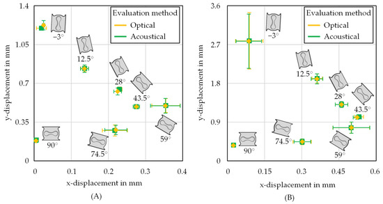 First, the influence of the optical and acoustic fracture evaluation methods on the determination of fracture are shown. Therefore, the displacements at the fracture in the x- and y-directions of the butterfly tests were determined using both methods and are presented as average values with standard deviation in Figure 7A for HCT980X and in Figure 7B for HCT780C. The tendency of the displacement at the fracture regarding the loading angle is similar for both materials and both evaluation methods. The displacement in the y-direction is larger than in the x-direction since the y-direction is the main forming direction. The y-displacement at the fracture rises from a loading angle of 90° to −3°, while the x-displacement rises from a loading angle of 90° to 59° and reduces again until −3°, which can be explained by the rotation of the test setup. Comparing the displacements at fracture of both materials, HCT780C fails at higher x- and y-displacements due to its better formability compared to HCT980X [29]. Interestingly, the loading angles 74.5°, 59°, and −3° show a higher scattering of the standard deviation. Since the scattering is present for both materials and both evaluation methods, it is attributed to the loading angle. Contrasting both evaluation methods and considering the standard deviation, no significant difference could be observed regarding the determination of fracture from both methods. Therefore, both methods are equally suited to determining the onset of the fracture. However, both assume a different location of fracture, the influence of which on the characteristic values of the stress triaxiality, normalised Lode angle, and equivalent plastic strain will be analysed next.