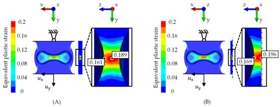 The nodes of one side of the specimen were restricted for displacements and rotations in all directions. On the opposite side, the nodes were applied with displacements from the experiments in x-direction and y-direction . For each loading angle, material, and evaluation method, the corresponding average displacements were set as boundary conditions. Likewise, the velocity was set to 0.02 mm/s as it was for the experiments. The rolling direction was set as for the experiments perpendicular to the unity mark shape. The butterfly models were analysed implicitly with the “Parallel Multi-Frontal Sparse Solver” from LS-Dyna version R12. Double precision and hourglass control were used for calculation.