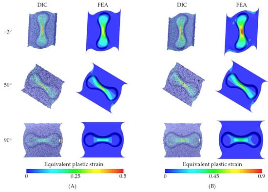 Comparison of the equivalent plastic strain from digital image correlation (DIC) as well as from the numerical models (FEA) of the butterfly specimen for HCT980X (A) and HCT780C (B).