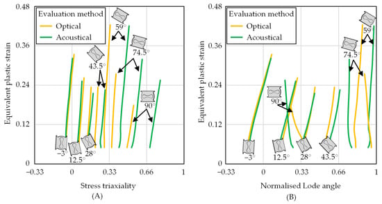 According to each evaluation method, the butterfly models were analysed in the middle of the specimen’s surface for the optical method and inside the centre of the specimen for the acoustic method. For each of the simulation models, the equivalent plastic strain, stress triaxiality, and normalised Lode Angle were determined as a function of time. The equivalent plastic strain–stress triaxiality and the equivalent plastic-strain-normalised Lode angle curves are depicted in Figure 10A,B, exemplarily for HCT980X. The same behaviour was observed for HCT780C. For both evaluation methods, a similar development of the curves is visible for the loading angles from −3° to 28° regarding the stress triaxiality and the normalised Lode angle. A small difference in the curves is recognisable for the loading angle 43.5°, which increases towards higher loading angles. The curves from the acoustic evaluation method begin and end at higher stress triaxialities than the curves from the optical method. Comparing the maximum of the equivalent plastic strain, both evaluation methods lead to similar values until a loading angle of 59°. For higher loading angles, the equivalent plastic strain is increased for the acoustic evaluation method compared to the optical. This indicates not only an increased difference in the stress state over the sheet thickness but also a high gradient of the equivalent plastic strain over the sheet thickness for loading angles over 59°.